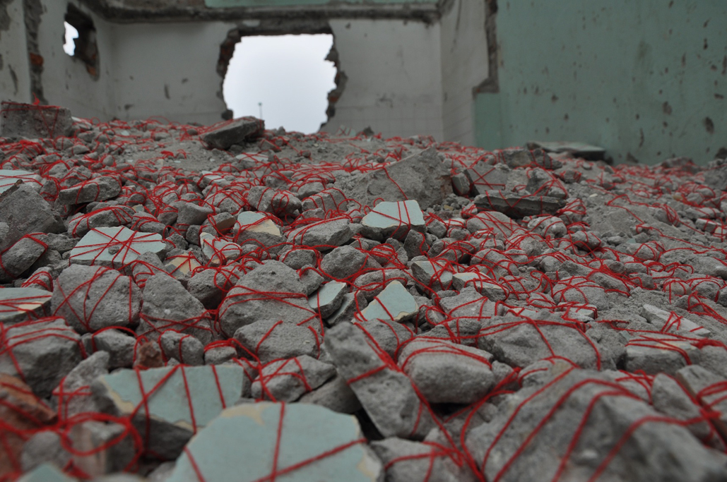Over the course of four days, Nguyen Hong Ngoc and I worked five hours a day with red wool to knit together all the pieces of broken bricks and mortar on a floor of a destroyed house. The house was taken down by the government in 2009 in order to build a new road. Unfortunately, up until the present, this planned construction has been stalled by corruption and other questionable and sensitive circumstances of the government. It is an ongoing and common situation in many other plans throughout Vietnam.